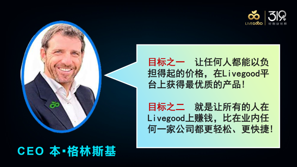 只所以选择LIVEGOOD,首先是非常认可LIVEGOOD创使人BEN GLINSKY的使命感:1. 以任何人都能负担的起的价格,使用地球上最优质的营养补充品,帮助人们获得健康并保持健康。2. 助您赚钱比业界任何一家公司都更轻松、更快捷。